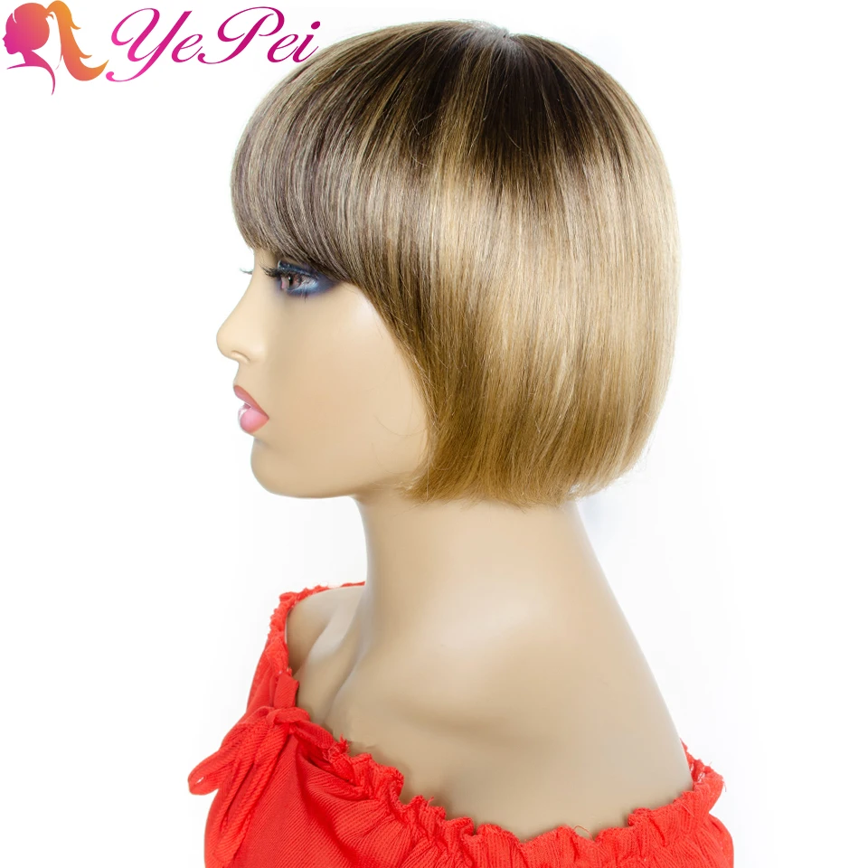 Name: Ombre recto pelucas de cabello humano cabello Remy brasileño Bob corto peluca con flequillo 4/27 rubio miel máquina completa pelucas Yepei pelo